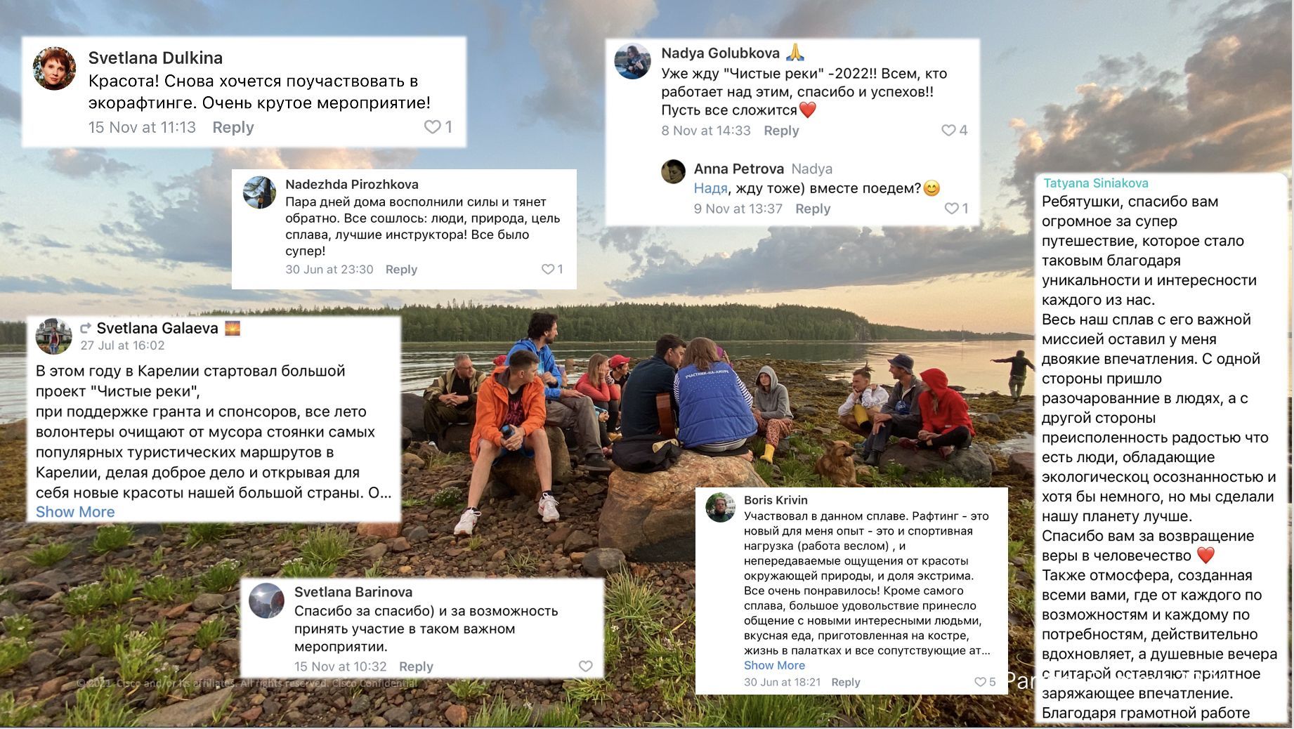 12 экологических экспедиций общей продолжительностью 64 дня на которых 341 эковолонтер проработав 1876 человеко-дней произвели уборку и благоустройство 194 территорий на живописных и труднодоступных берегах порожистых рек Карелии и на островах Белого моря. Нами было установлено 30 информационных табличек, вывезено и утилизировано 35 бочек битого стекла и свыше 800 мешков мусор
